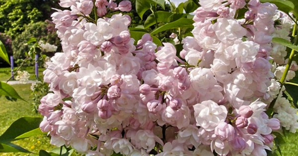 Бутони великі, лілово-пурпурові. Квітки великі, 2,5 см в діаметрі, рожево-білі з перламутровим відтінком, махрові (в 3, рідше 2 зближених віночка). Пелюстки підняті, зігнуті всередину. За формою квітки схожі з квітками махрових поліантових трояндочок. До кінця цвітіння квітки вигоряють до білого забарвлення. Суцвіття великі, вертикально-розташовані, зібрані з 1-2 пар пірамідальних ажурних мітелок. Час цвітіння: травень - червень.