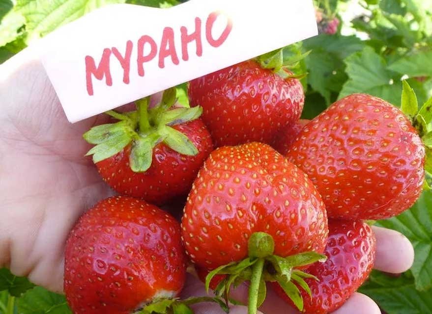 Полуниця Мурано - це ремонтантний, ранній сорт полуниці італійської селекції. Новинка на ринку, невеликий кущ висотою до 30 см з яскраво-зеленим листям. Маса ягоди 25-35 м Колір ягід яскраво-червоний, з блискучою поверхнею. Смак солодкий, гармонійний, насичений з вираженим ароматом. Плоди мають великі розміри і форму правильного конуса.