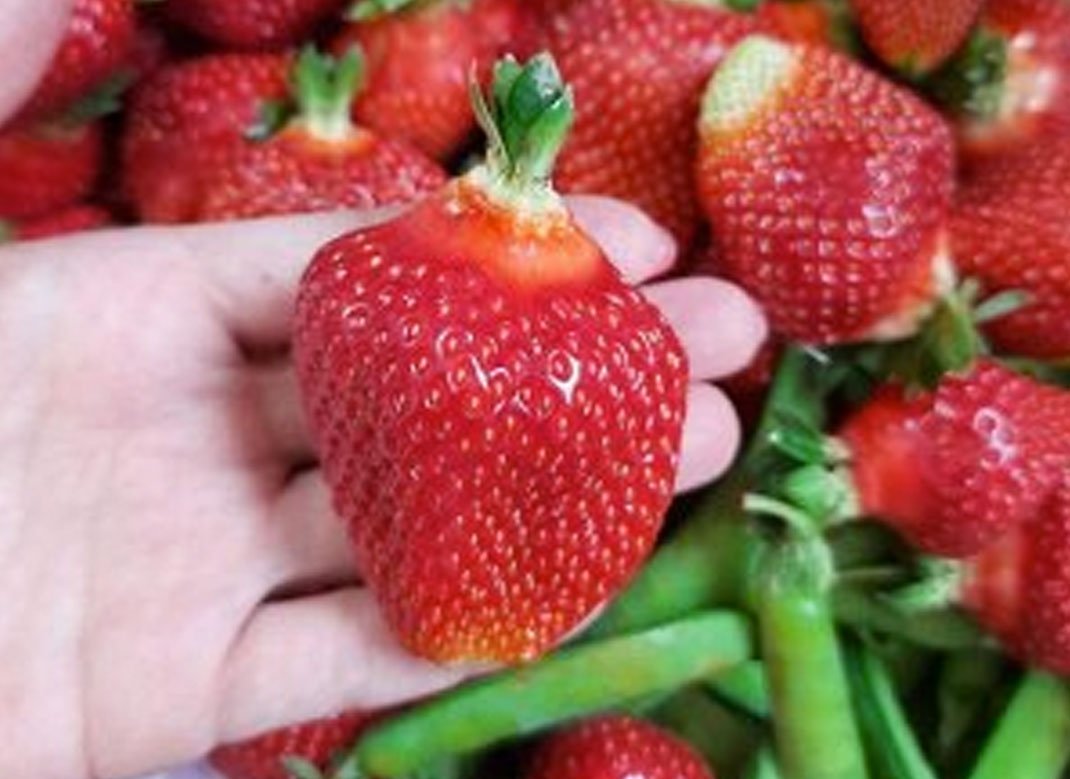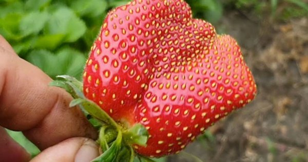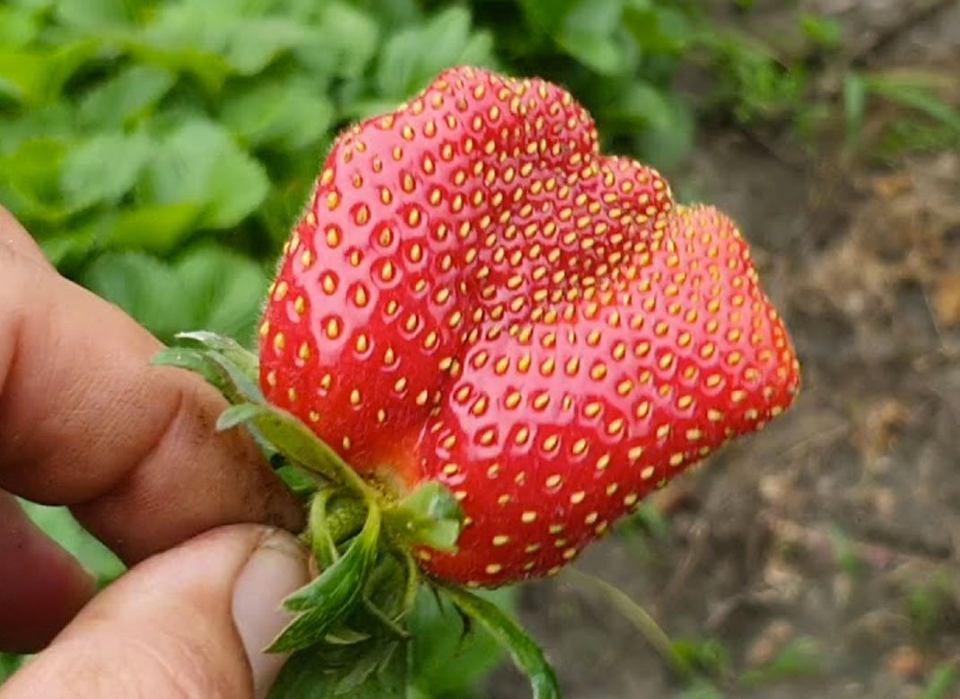 Ягоди великі, вагою від 45 до 50 г, іноді до 70 г. Вони мають конусоподібну форму з яскравим червоним кольором та глянцевою поверхнею. М'якоть щільна і соковита, з приємним солодким смаком і вираженим суничним ароматом. Кущі висотою від 25 до 35 см, розлогі, досягають діаметра до 50 см. Листя великі, насичено темно-зелені, а квітконоси потужні, розташовані на рівні листя.