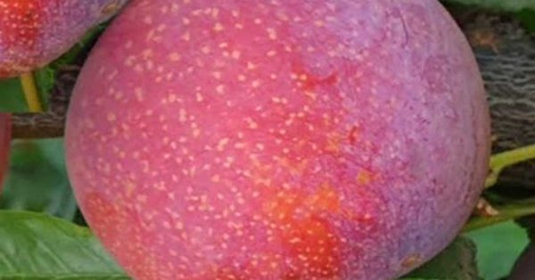 Плоди великі, масою до 150 г, округло-овальної, трохи плескатої форми, яскравого червоно-рожевого кольору, покриті пруіновим нальотом з безліччю білих точок.