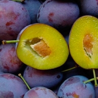Великі плоди масою від 50 до 70 г, при нормуванні можуть досягати 100 г. Овальні, злегка стиснуті біля плодоніжки. Основний зелений колір плоду покритий красивим бордово-фіолетовим нальотом із синім відтінком. М’якоть жовто-зелена, ніжна, соковита, з приємним кисло-солодким смаком. Кісточка середнього розміру легко відділяється.