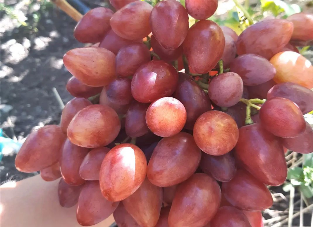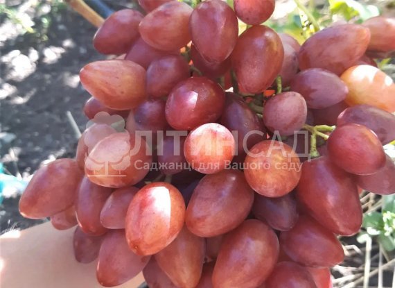 Грона великі в районі 800-1500г, окремі можуть досягати і 2кг. Кетяги середньої щільності та з дуже гарним товарним виглядом. Ягоди дуже великі  яйцевидної подовженої форми та яскравого рожевого кольору, їхня маса коливається від 15 до 25 г. М'якоть  щільна, м'ясиста, соковита з  приємним гармонійним смаком та легеньким ароматом мускату.