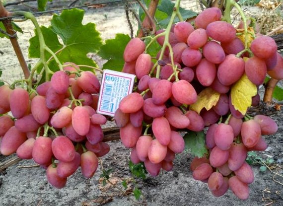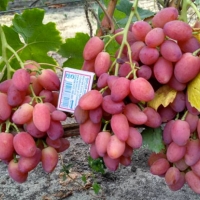 Квітка не вимагає додаткового запилення. Конусоподібні грона важать від 700 грам до 1200 грам, вони не щільні, пухкі. Виноградини подовжені, об'ємні, трохи звузилися з одного краю, жовто-рожевого кольору. Середня вага ягоди близько 15-18 грам, це свідчить про їх крупності.
