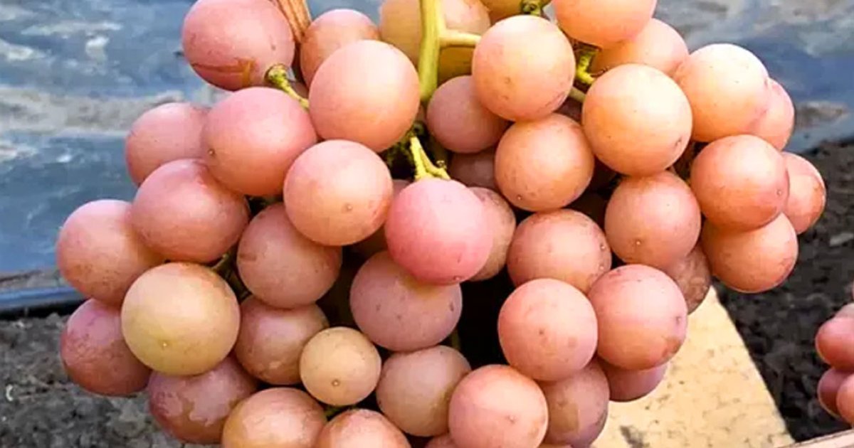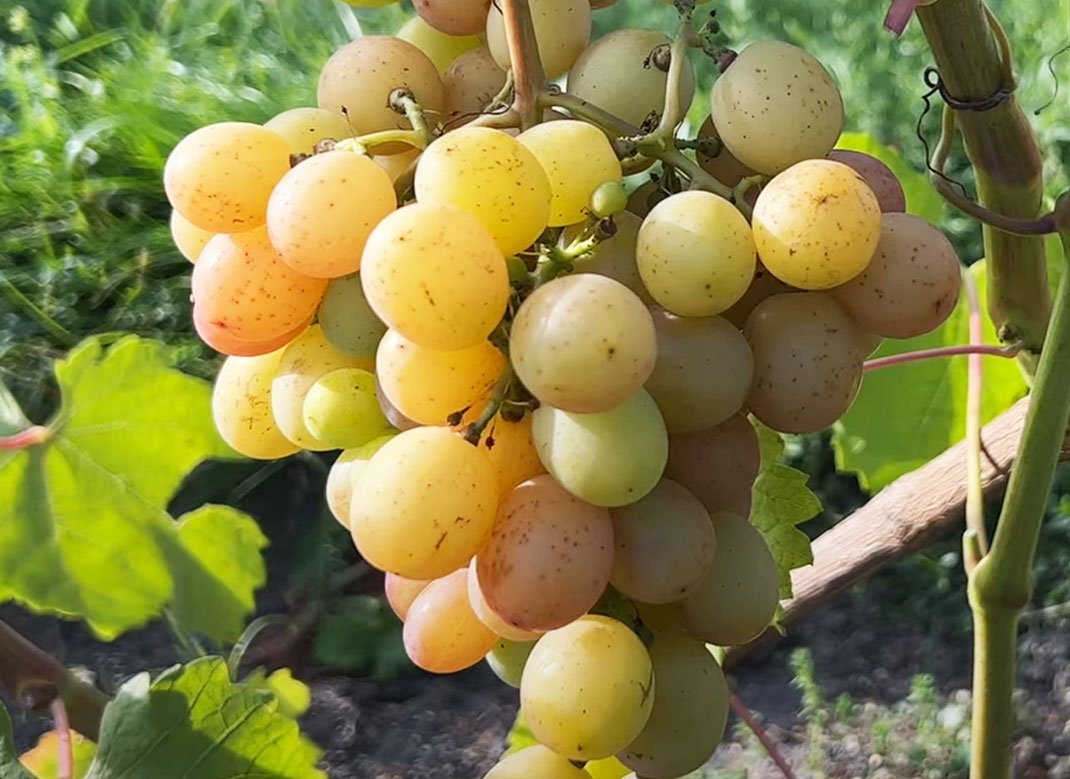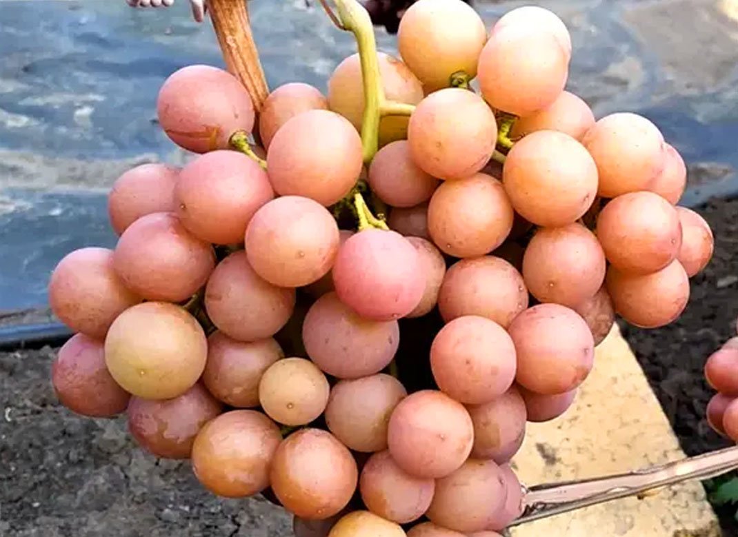 Кущі щеплені та кореневладні, з великою силою росту. Квітки двостатеві, що сприяє самозапиленню та підвищенню врожайності. Грона конічні, ошатні, помірної щільності,  маса яких від 800 грамів до 1,2 кг. Ягоди овальні, рожевого кольору, розміром приблизно 30х28 мм, з тонкою шкірочкою, яка легко з'їдається. М'якоть м'ясисто-соковита, з приємним гармонійним смаком і легким мускатним відтінком. Ягоди не розтріскуються після дощів.