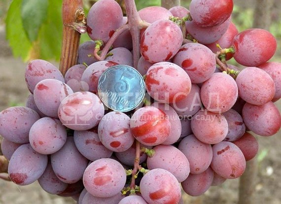 Це урожайний сорт, грона можуть утворюватися в надлишку, тому буде потрібно нормування суцвіть. Яйцеподібні виноградини темно-рожеві, з білим нальотом, який надає фіолетовий відтінок.